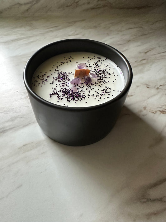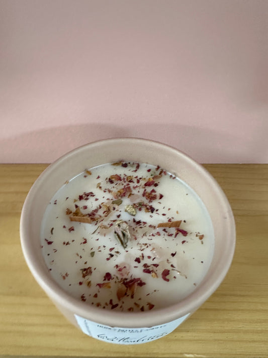 Our beautiful Manifestation Candles are made with healing crystals, 100% natural dried flowers, and toxin free wax.